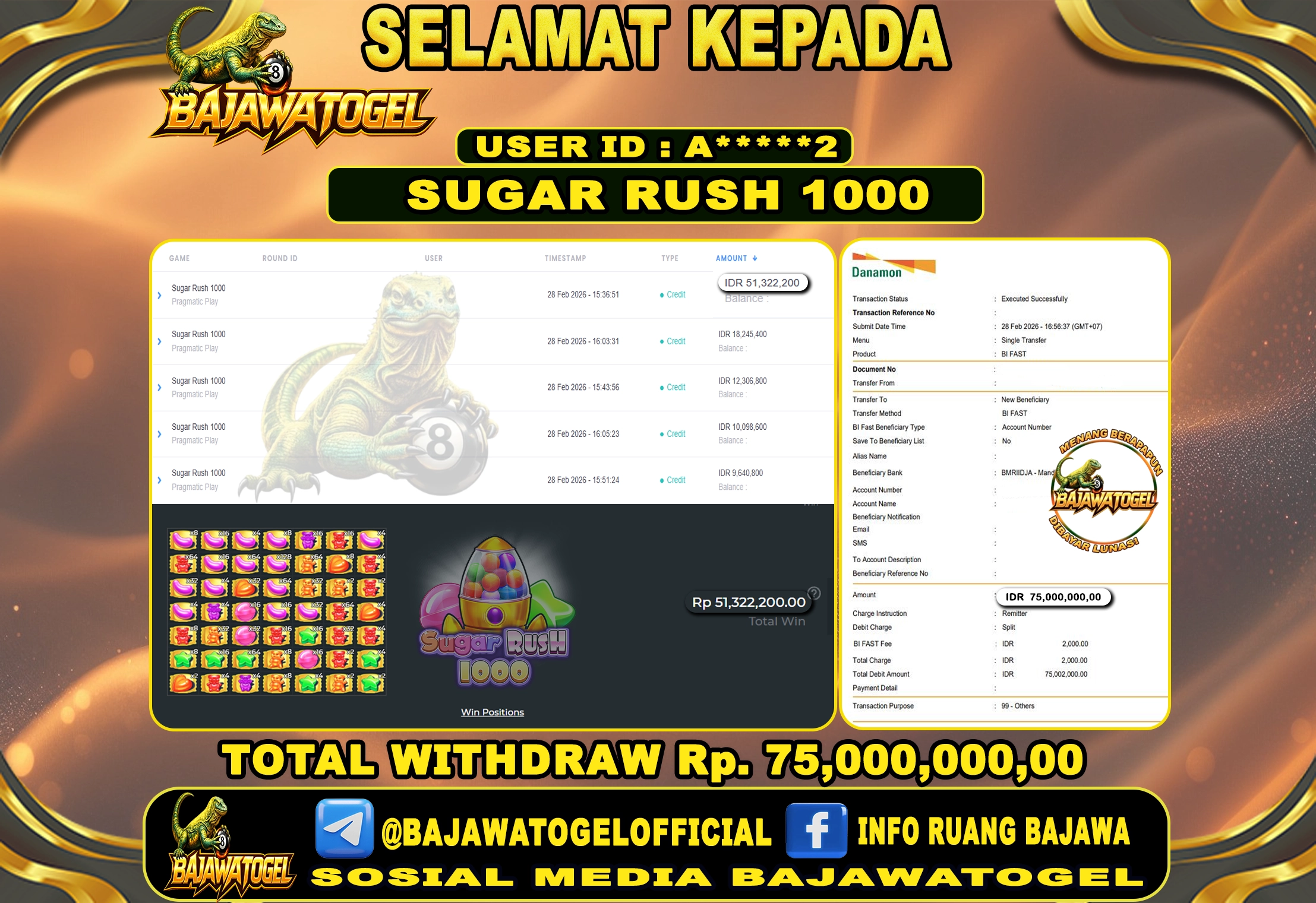 BUKTI JACKPOT SLOT SUGAR RUSH 1000 MINGGU, 01 MARET 2026 Rp.75.000.000 - LUNAS