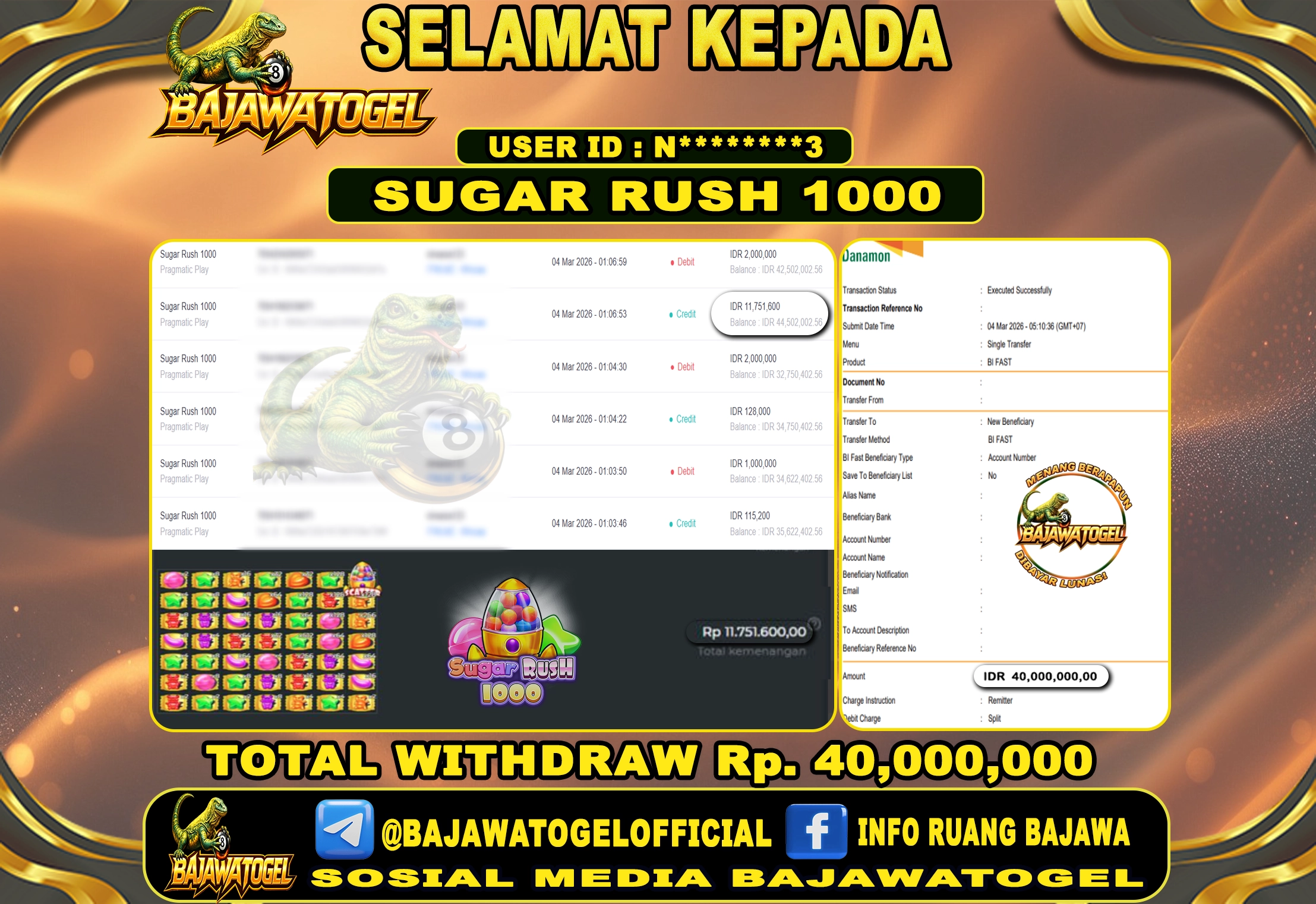 BUKTI JACKPOT SLOT SUGAR RUSH 1000 RABU, 04 MARET 2026 Rp.40.000.000 - LUNAS