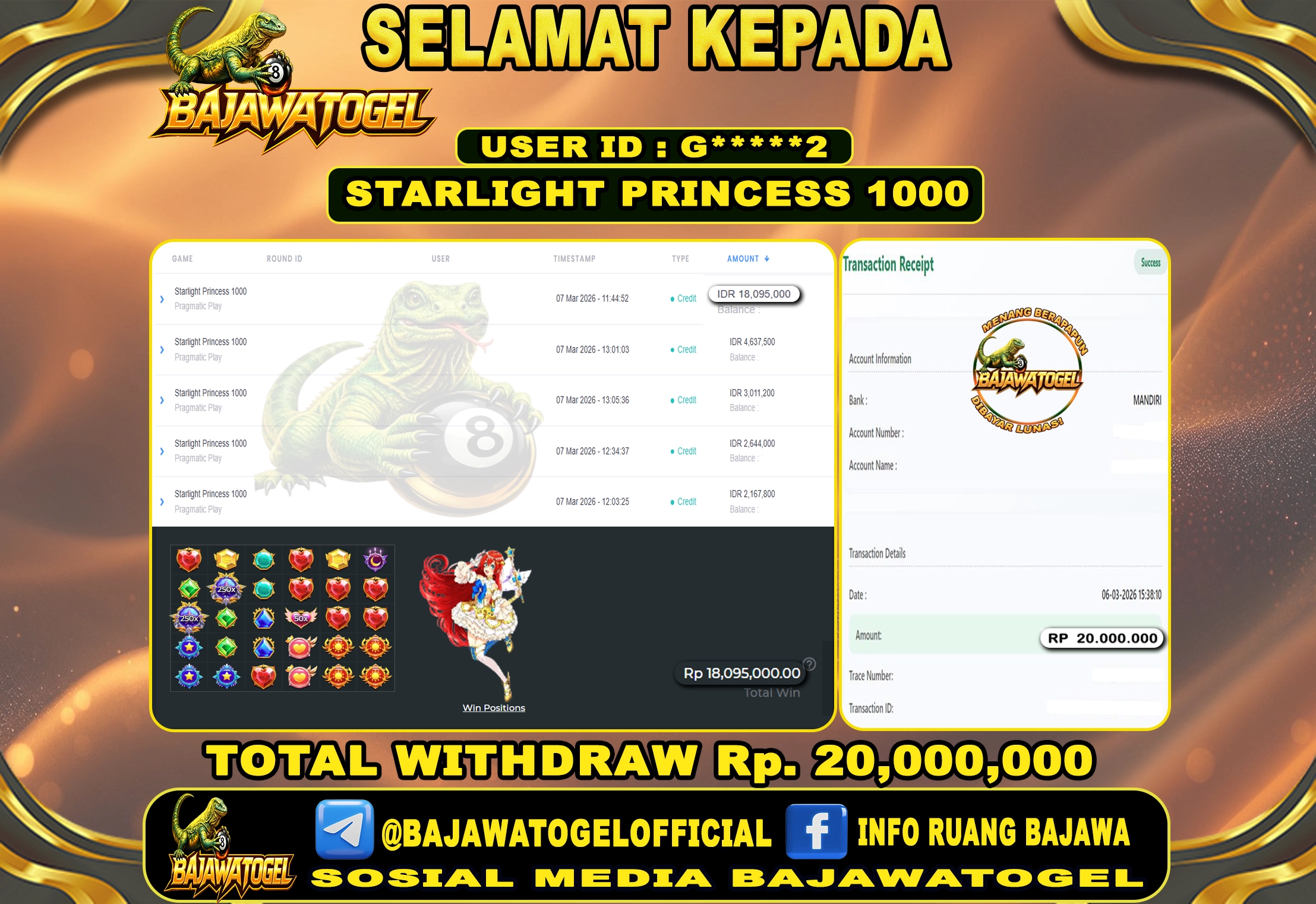 BUKTI JACKPOT SLOT STARLIGHT PRINCESS 1000 SABTU, 07 MARET 2026 Rp.20.000.000 - LUNAS