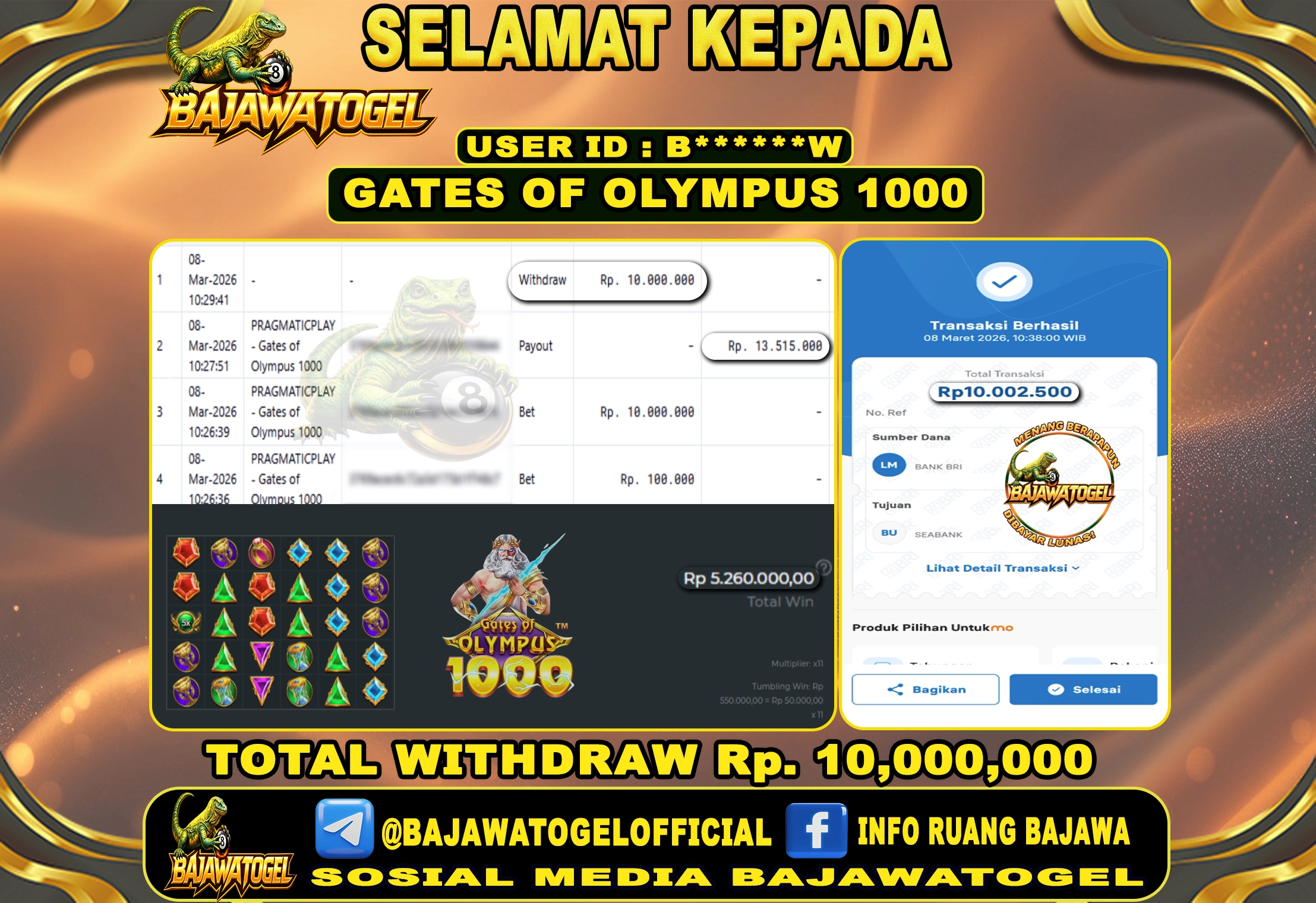 BUKTI JACKPOT SLOT GATES OF OLYMPUS 1000 MINGGU, 08 MARET 2026 Rp.10.000.000 - LUNAS