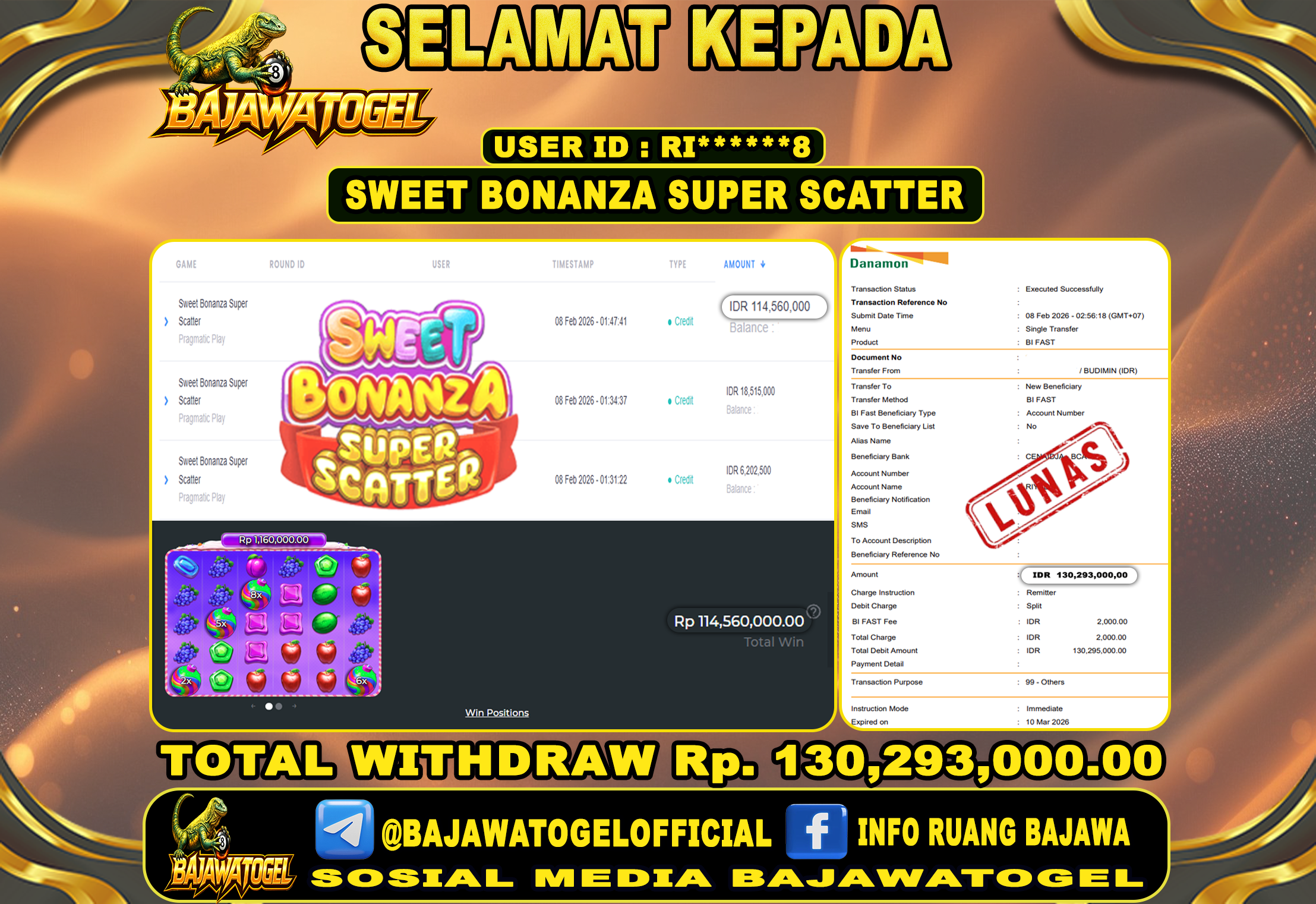 Bukti Jackpot Slot Sweet Bonanza Super Scatter Online Minggu, 08 Februari 2026 Rp. 130,293,000 - LUNAS