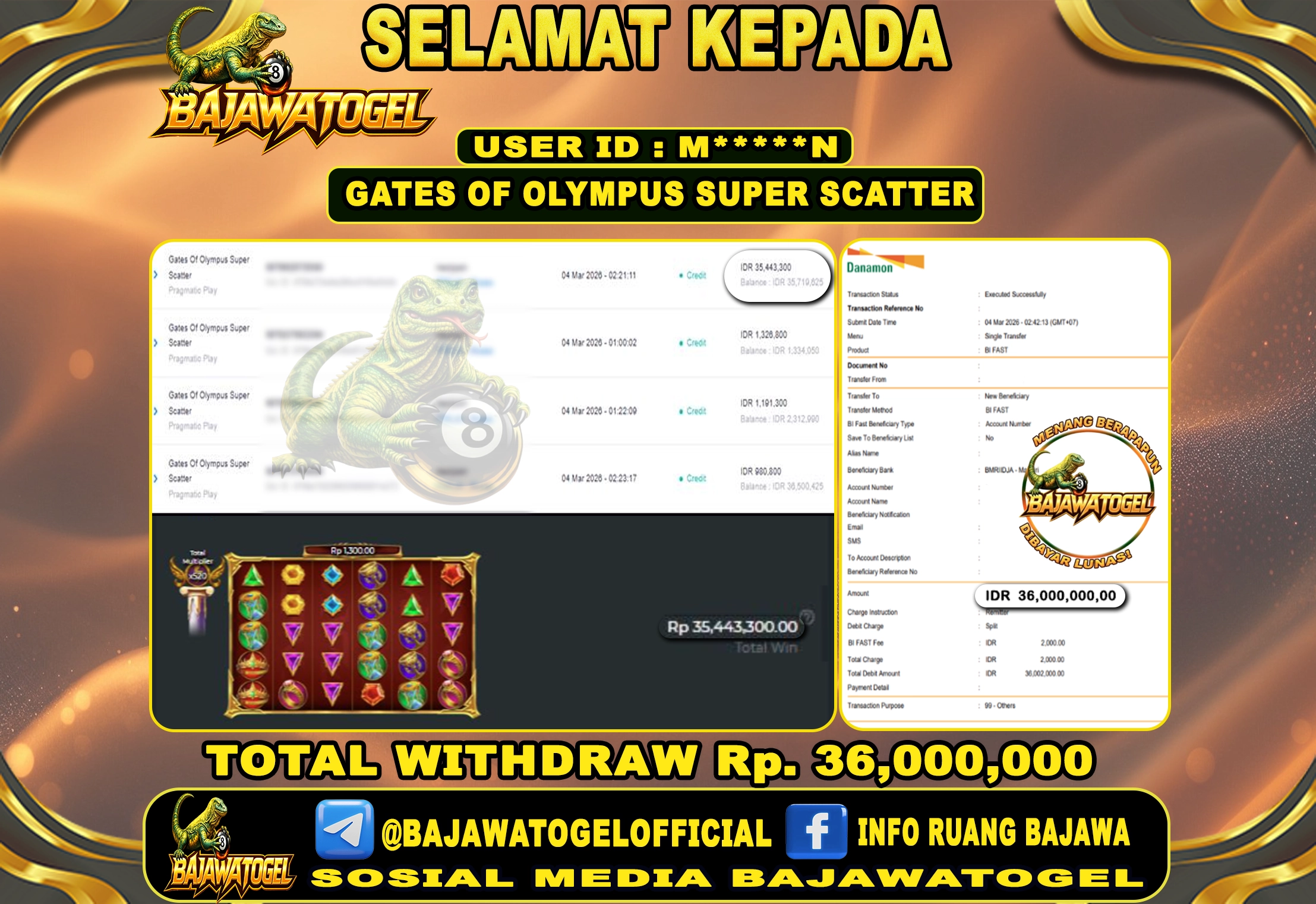 BUKTI JACKPOT SLOT GATES OF OLYMPUS SUPER SCATTER RABU, 04 MARET 2026 Rp.36.000.000 - LUNAS
