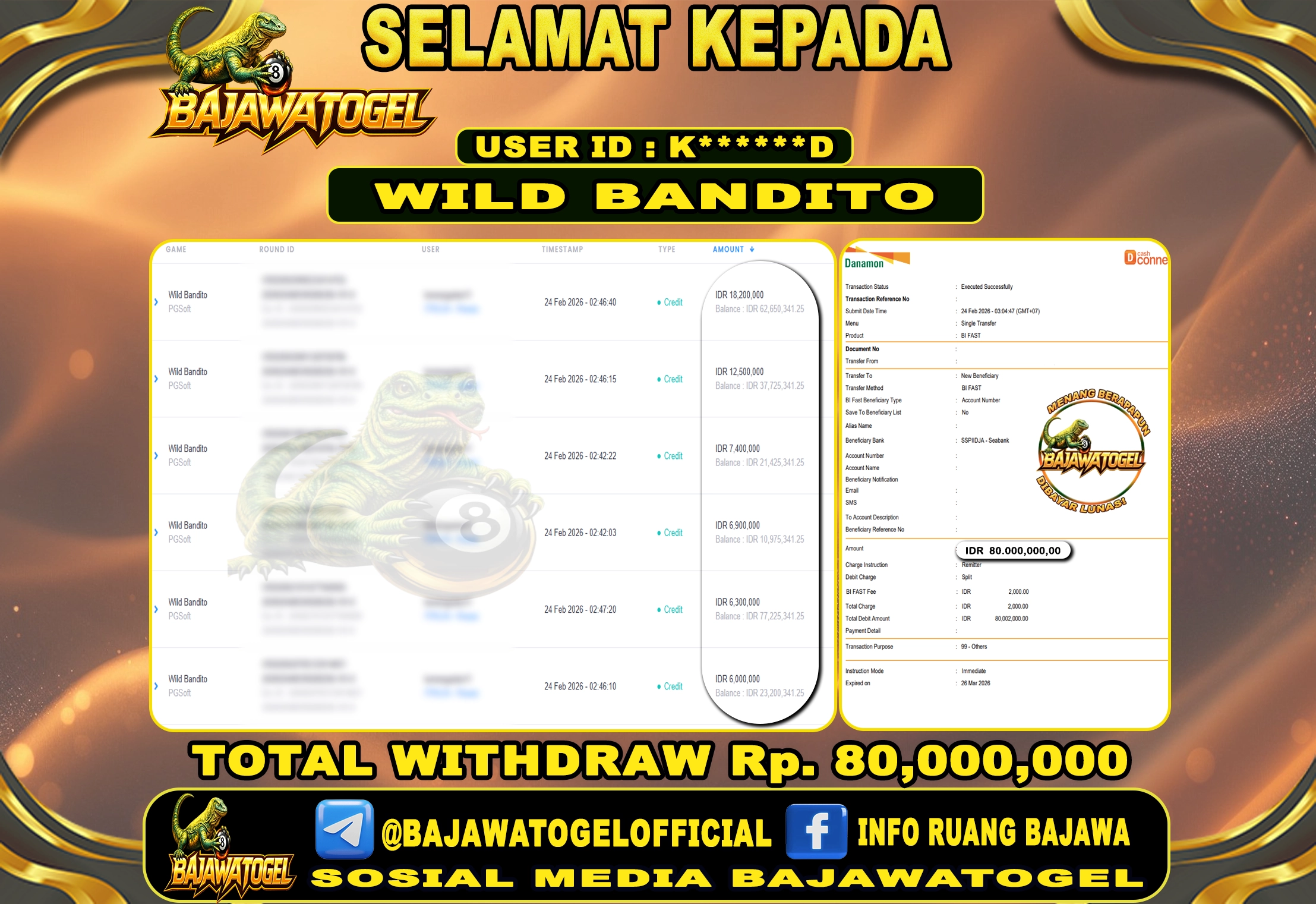 BUKTI JACKPOT SLOT WILD BANDITO RABU, 25 FEBUARY 2026 Rp.80.000.000 - LUNAS