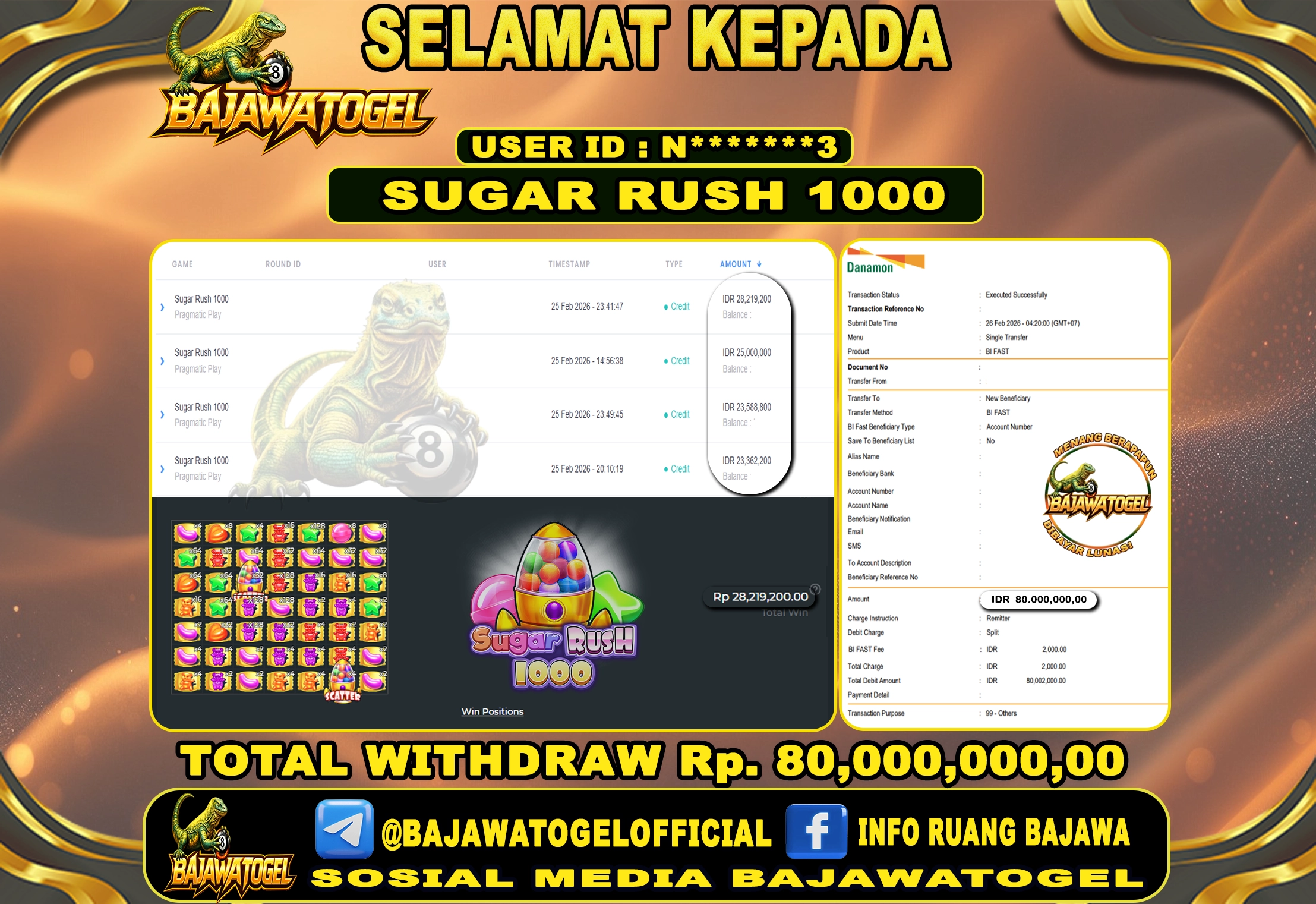 BUKTI JACKPOT SLOT SUGAR RUSH 1000 KAMIS, 26 FEBUARY 2026 Rp.80.000.000 - LUNAS