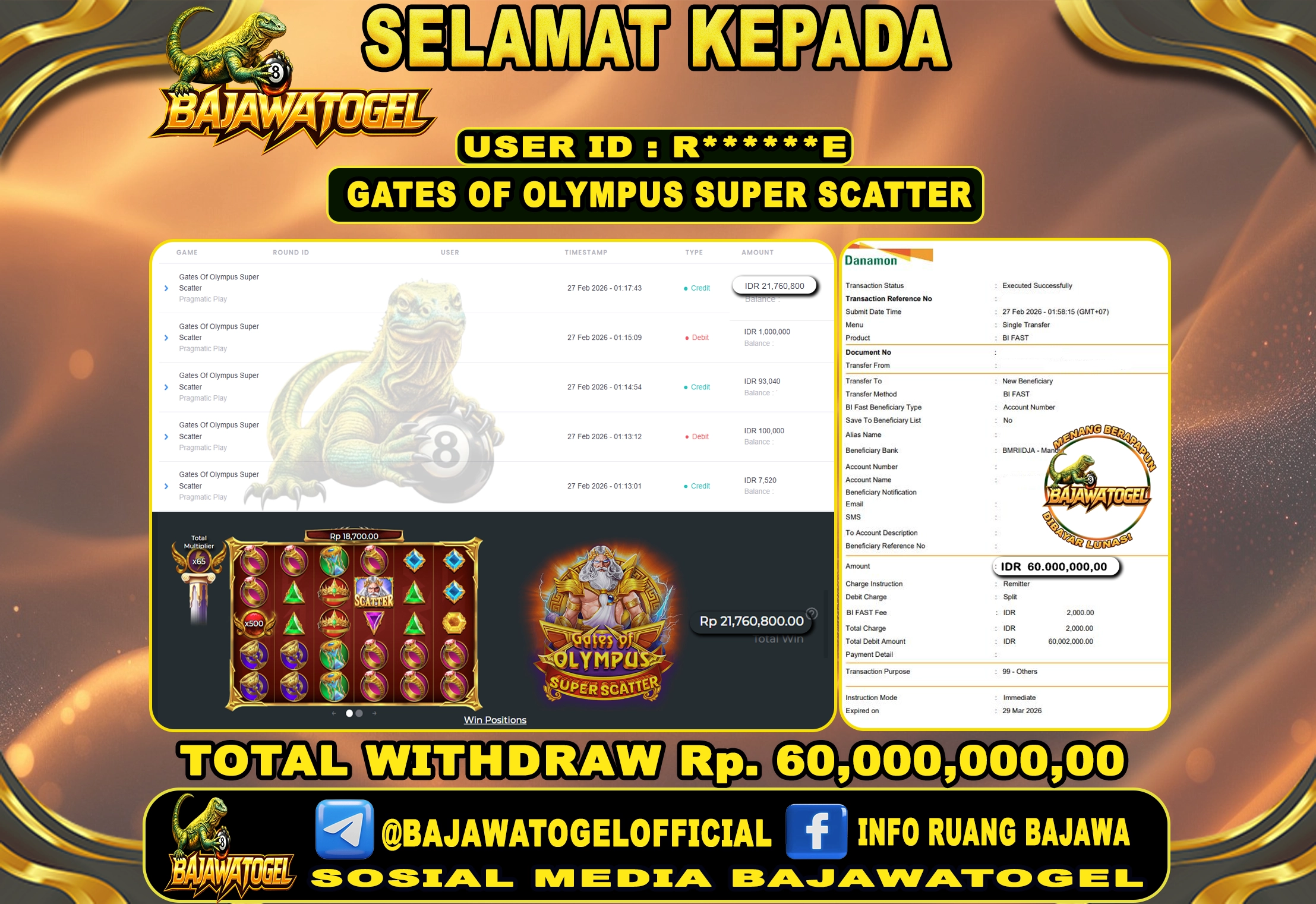 BUKTI JACKPOT SLOT GATES OF OLYMPUS SUPER SCATTER JUMAT, 27 FEBUARY 2026 Rp.60.000.000 - LUNAS