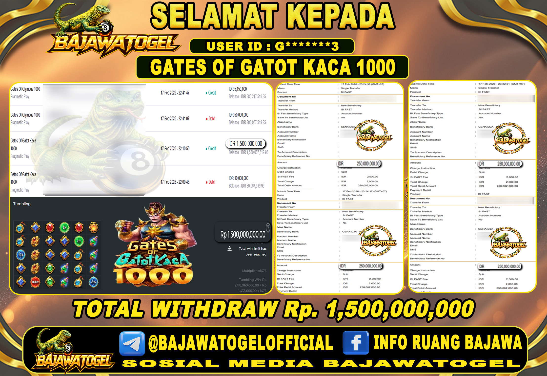 BUKTI JACKPOT GATES OF GATOTKACA X1000 Selasa, 17 Februari 2026 Rp.1,500,000,000 - LUNAS