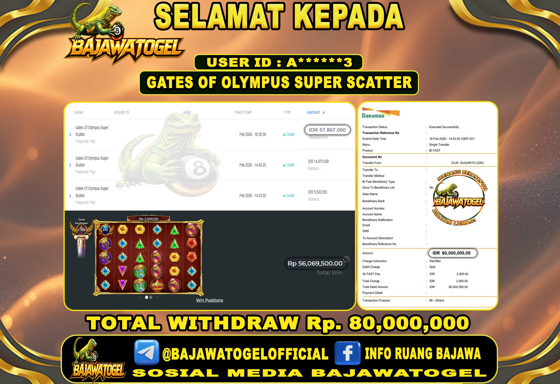 BAJAWATOGEL– Bukti Jackpot Slot Online Rabu ,18 Februari 2026 menjadi sorotan para pemain karena menunjukkan kemenangan nyata yang berhasil diraih member melalui sistem permainan yang transparan dan data result yang akurat. Pada penarikan hari Sabtu tersebut, banyak pemain berhasil menembus jackpot di BAJAWATOGEL.