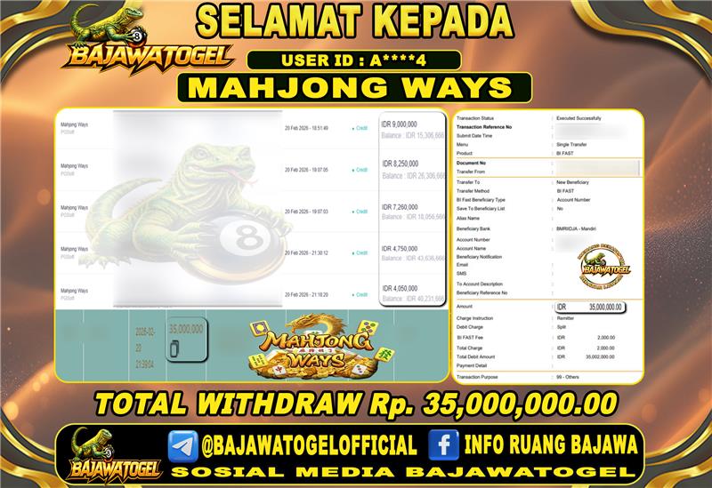BUKTI JACKPOT SLOT MAHJONG WAYS SABTU, 21 FEBUARY 2026 Rp.35.000.000 - LUNAS