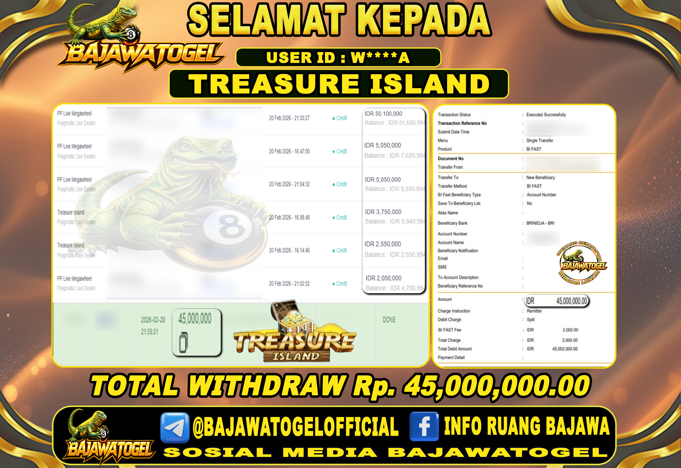 BUKTI JACKPOT SLOT TREASURE ISLAND SABTU, 21 FEBUARY 2026 Rp.45.000.000 - LUNAS