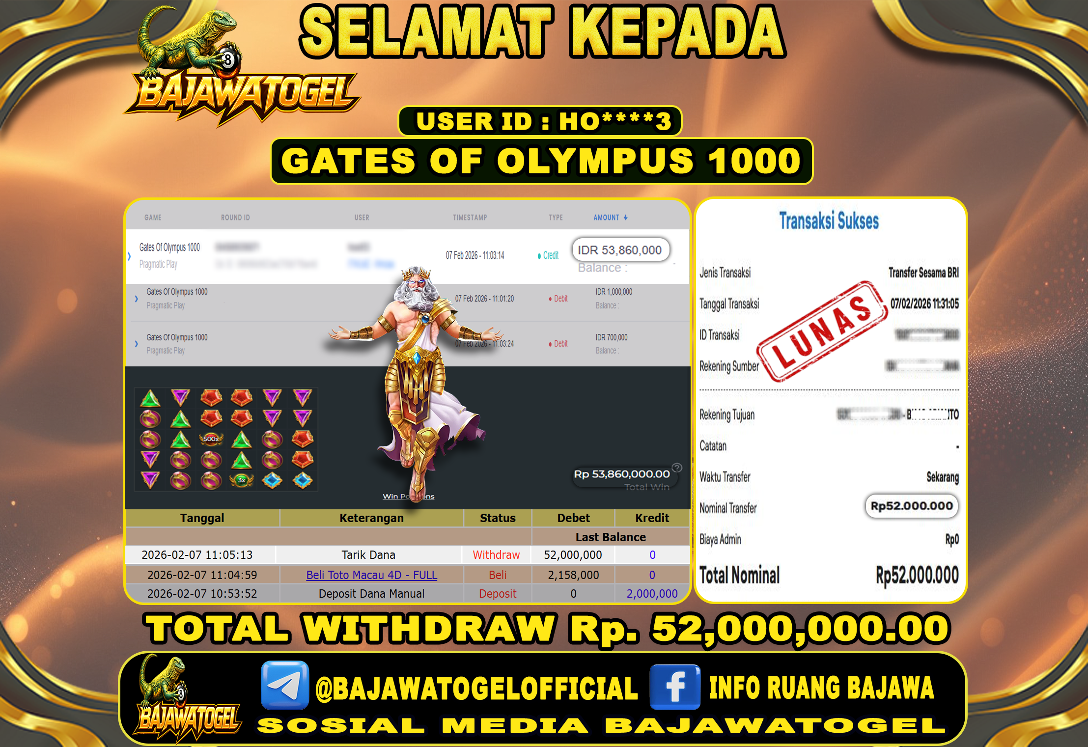 Bukti Jackpot Slot Gates Of Olympus 1000 Online Sabtu, 07 Februari 2026 Rp. 52,000,000 - LUNAS