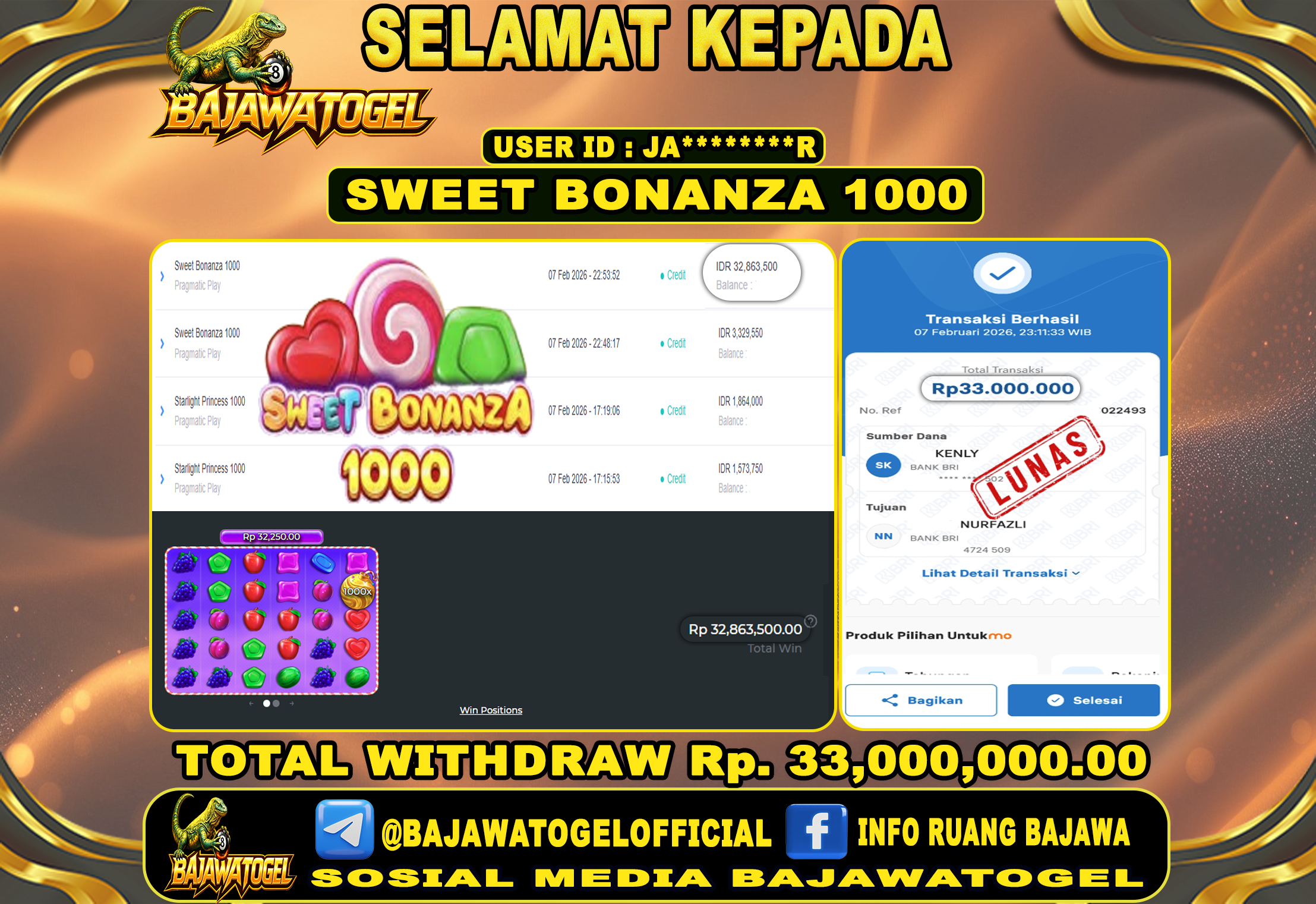 Bukti Jackpot Slot Sweet Bonaza 1000 Online Sabtu, 07 Februari 2026 Rp. 33,000,000 - LUNAS