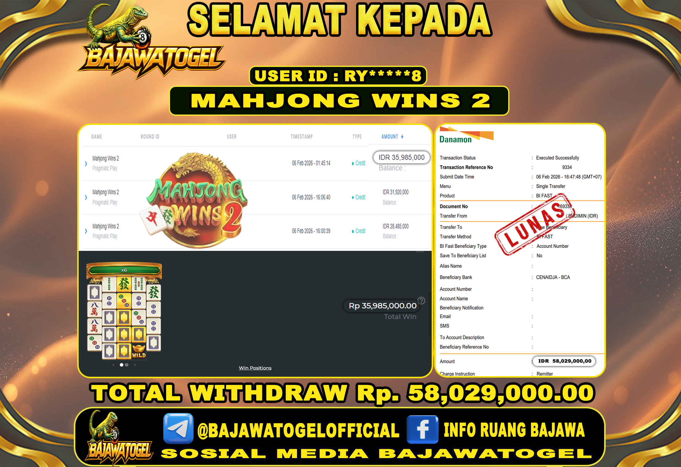 Bukti Jackpot Slot Mahjong Wins 2 Online Minggu, 08 Februari 2026 Rp. 58,029,000 - LUNAS