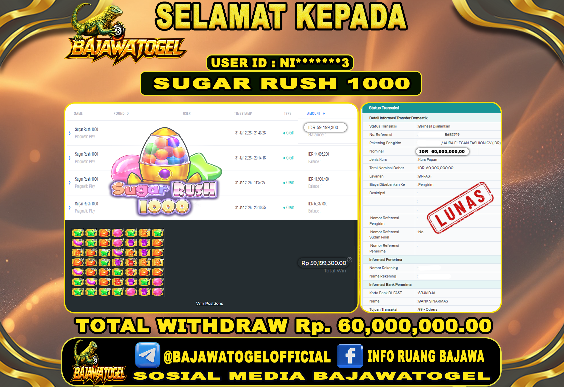 Bukti Jackpot Slot Sugar Rush 1000 Online Minggu, 08 Februari 2026 Rp. 60,000,000 - LUNAS