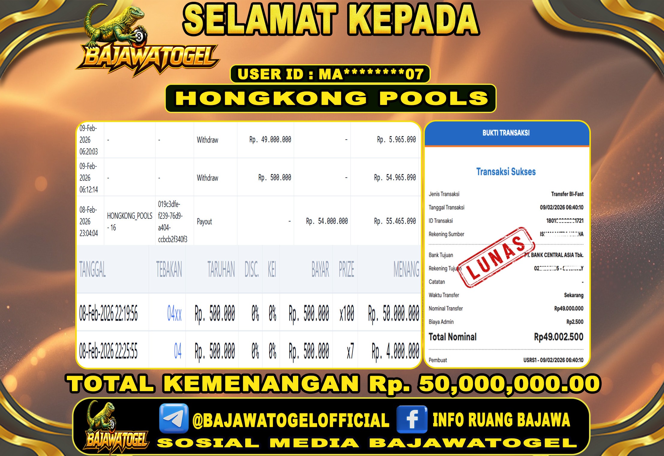 Bukti Jackpot Togel Di Pasaran Hongkong Pools Kamis, 09 Februari 2026 Rp. 49,000,000 - LUNAS