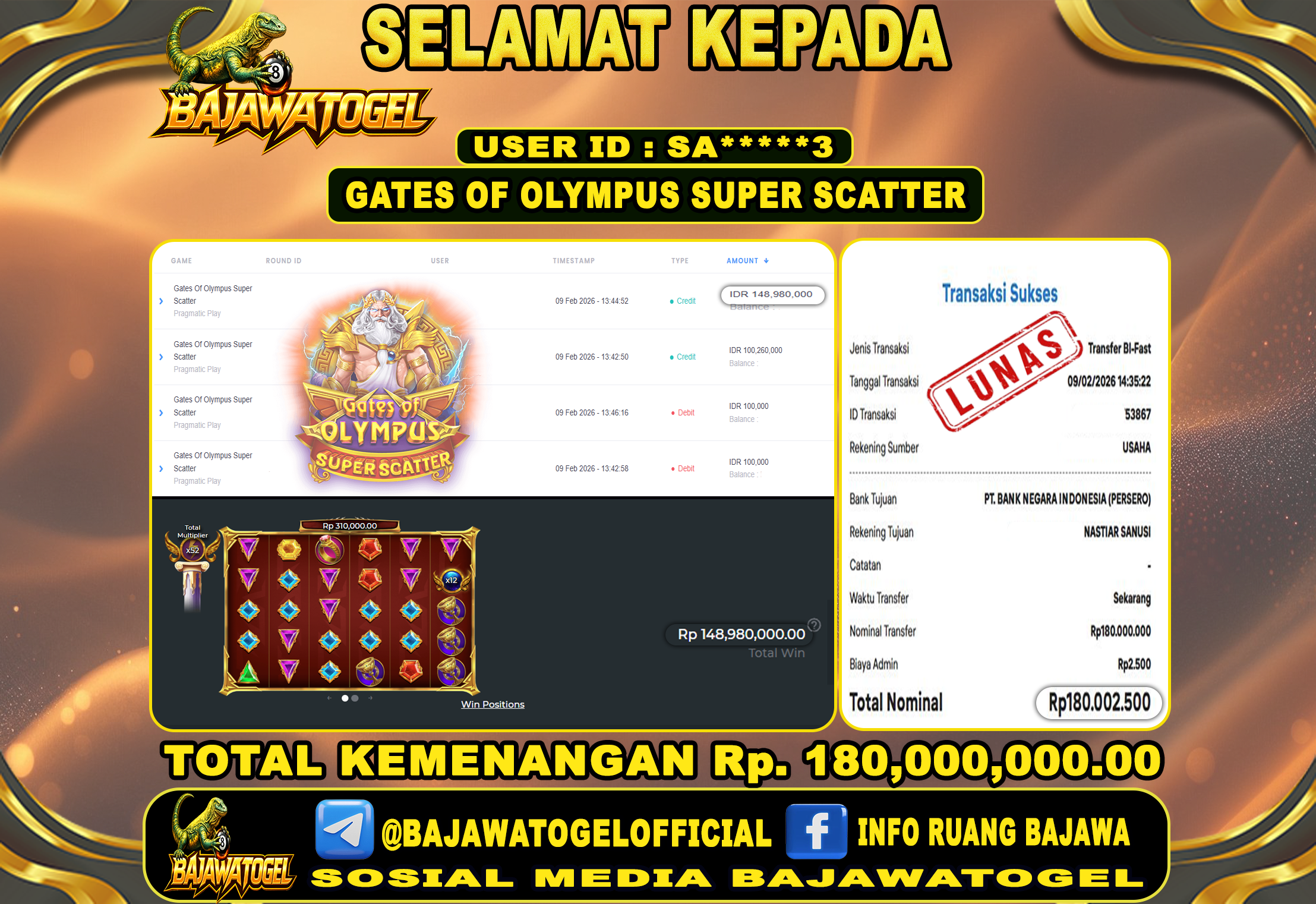 Bukti Jackpot Slot Gates Of Olympus Super Scatter Online Senin, 09 Februari 2026 Rp. 180,000,000 - LUNAS